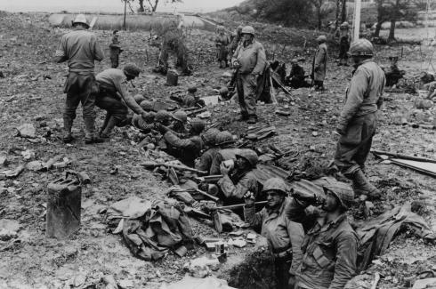 Les soldats de la 79e division d’infanterie américaine profitent d’un moment de répit aux abords du fort du Roule, fortification napoléonienne surplombant la ville.